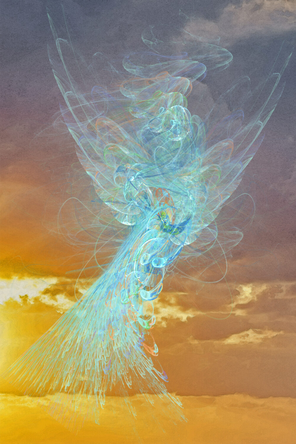 Das Bild "Aufwärts" ist eine Komposition aus diversen digital erstellten Fraktalen. Für mich ist es eine Lichtgestalt, die in den Himmel aufsteigt.