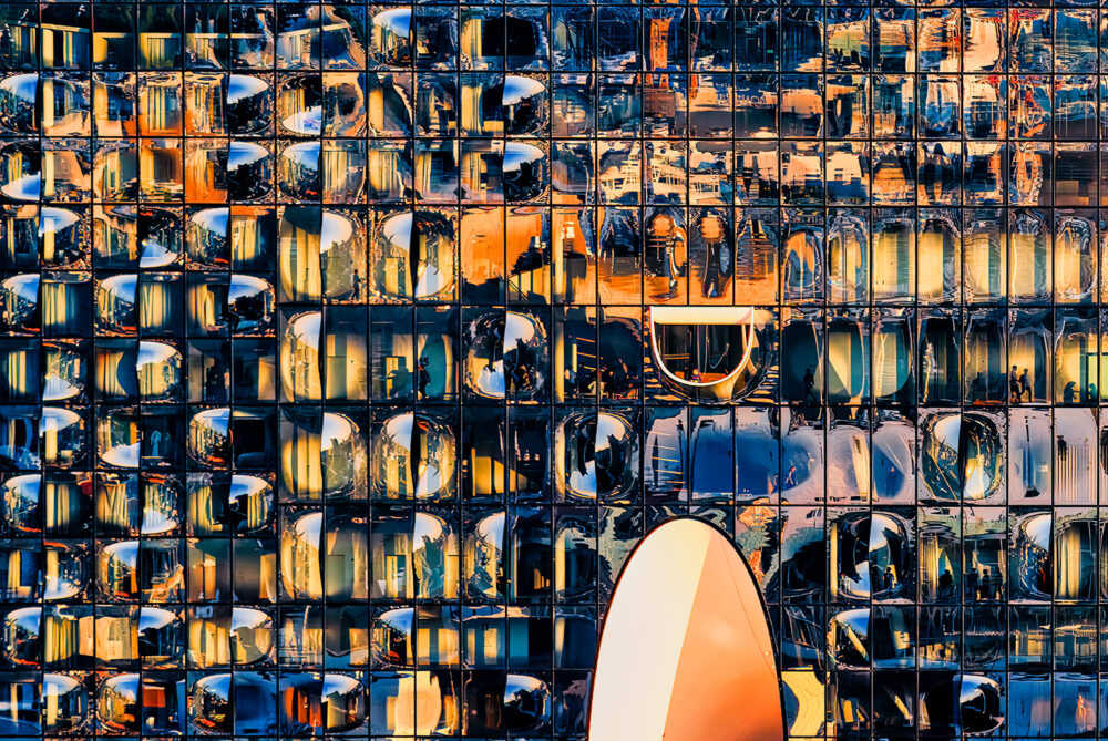 Dieses Foto  zeigt ein Detail eines Wahrzeichens der Stadt Hamburg. Die Fenster der Elbphilharmonie bei Sonnenuntergang. Es ist der linke Teil des Dyptichons.