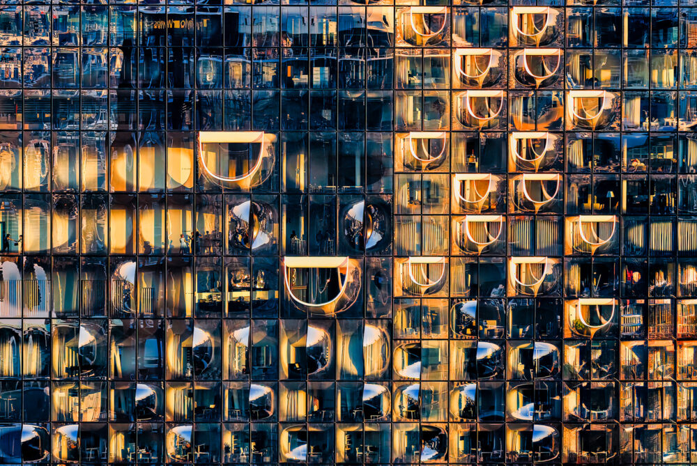 Dieses Foto  zeigt ein Detail eines Wahrzeichens der Stadt Hamburg. Die Fenster der Elbphilharmonie bei Sonnenuntergang. Es ist der rechte Teil des Dyptichons.