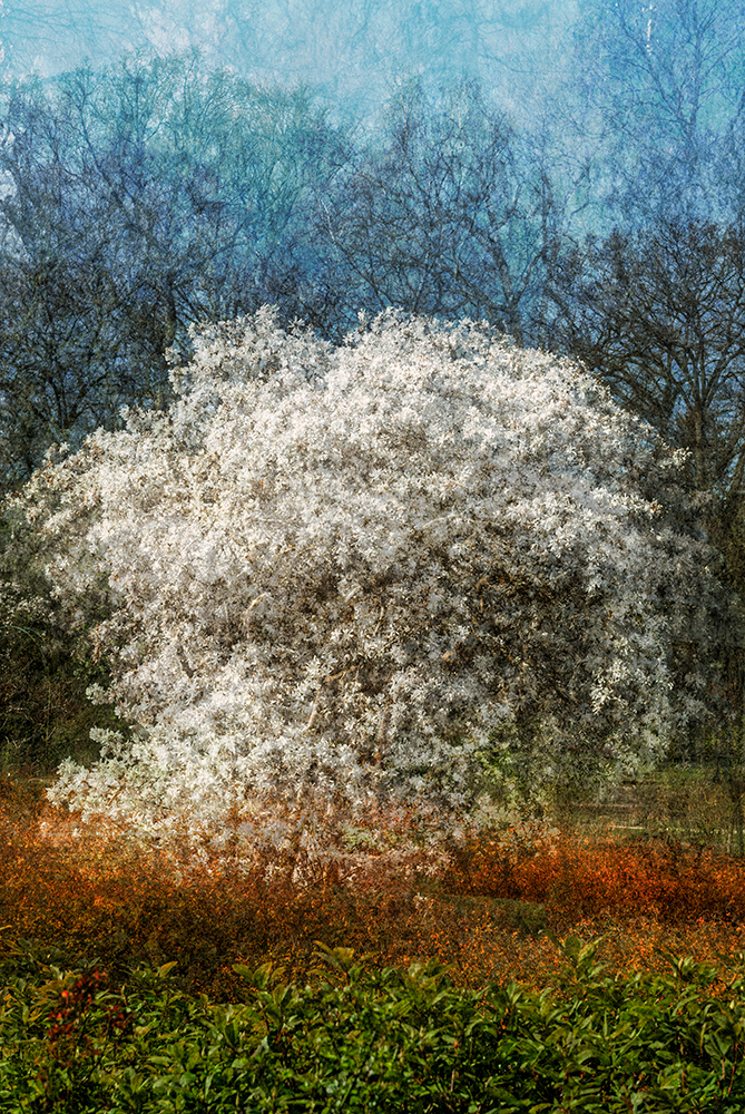Das Bild enstand aus 17 Einzelbildern. Während ich um die Magnolie herumgegangen bin habe ich die Aufnahmen gemacht. Im Bearbeitungsprozess werden die Fotos als Ebenen übereinandergelegt und durch spezielle Techniken entsteht das endgültige Werk. Die Technik heisst Intentional Camera Movement (ICM) und wurde von dem spanischen Fotografen Pep Ventosa kreiert.