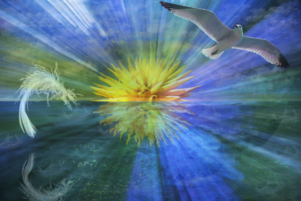 In dieser Fotocollage habe ich einen Traum visualisiert. Eine Dahlie als Sonne, weite Meerlandschaft und eine fliegende Möwe, die eine Feder verloren hat.