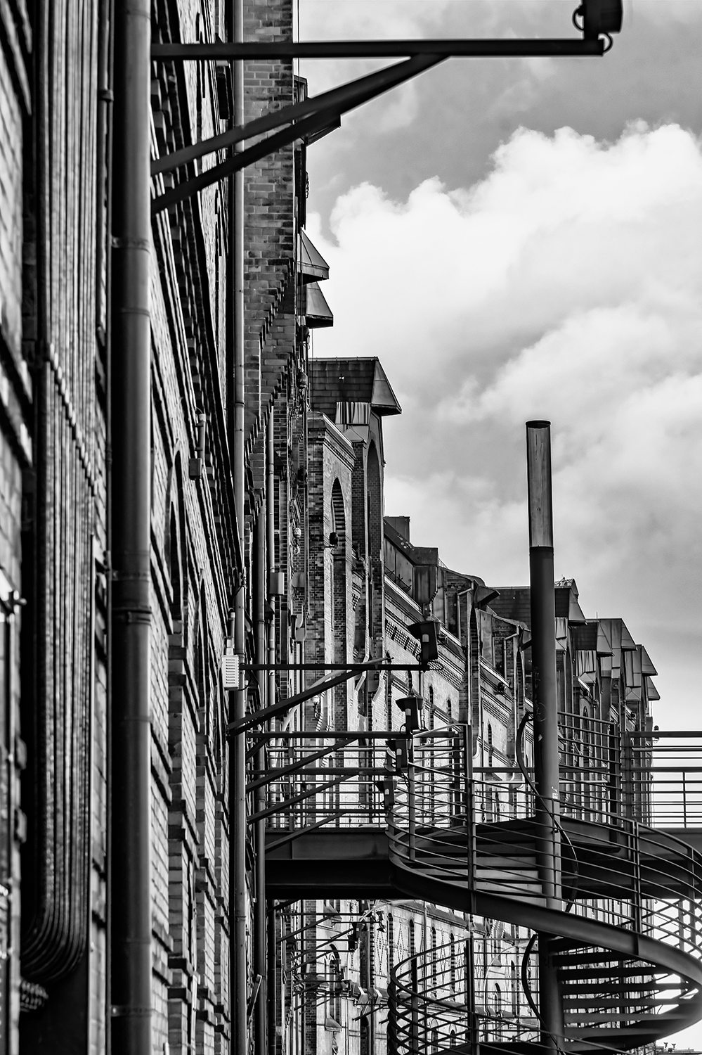 Das SW-Bild zeigt eine moderne Wendeltreppe aus Eisen, die zur Kibbelstegbrücke in der Speicherstadt Hamburg führt. Der Kontrast zwischen Moderne und historischem Gebäude hat mich fasziniert.